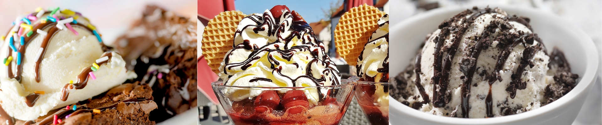 Fresh Whipped Creme, Fresh Sliced Strawberries, Sliced Bananas, Mini Marshmallows, Rainbow Mini Nonpareils, Reese’s Cup Pieces, Butterfinger Pieces, Heath Bar Pieces, Gummi Bears, Maraschino Cherries, Chopped Nuts, Brownie Chunks, Pretzel Chunks, Oreo Pieces, Rainbow Sprinkles, Chocolate Sprinkles, Chocolate Chips, M & M’s, M & M’s w/ peanuts, Shredded Coconut, Hershey’s Coffee Syrup, Reese’s Peanut Topping, Strawberry Topping, Pineapple Topping, Chocolate Topping, Butterscotch Topping, Caramel Topping, Wet Nut Topping, Cherry Topping, Hershey’s Chocolate Syrup, Hershey’s Caramel Syrup, Hershey’s Strawberry Syrup, and Hershey’s Coffee Syrup